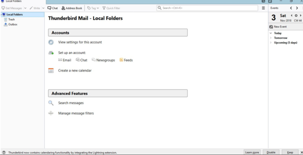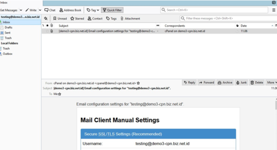 5. Apabila sukses, maka email akan muncul pada sidebar (bagian kiri dashboard Thunderbird). Pada bagian sidebar dapat Anda lihat akun yang baru dibuat. Terdapat inbox, trash, sent item dan sebagainya. Melalui Thunderbird Mail ini, Anda dapat melihat email masuk, menghapus email dan melakukan pengelolaan email dengan mudah.