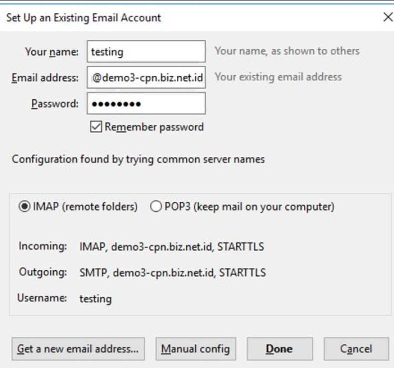 3. Tunggu sebentar maka akan muncul pilihan seperti gambar. Terdapat 2 tipe pengaturan email yaitu IMAP dan POP3. Untuk lebih mudahnya silakan pilih tipe IMAP. Agar email dapat sinkron dengan Thunderbird, maka Anda harus menyesuaikan konfigurasi yang ada di Webmail. Pada step di atas, terdapat informasi mengenai username, Incoming Server serta Outgoing Server. Untuk menyesuaikan dengan informasi yang ada di Webmail, silakan klik Manual Config.