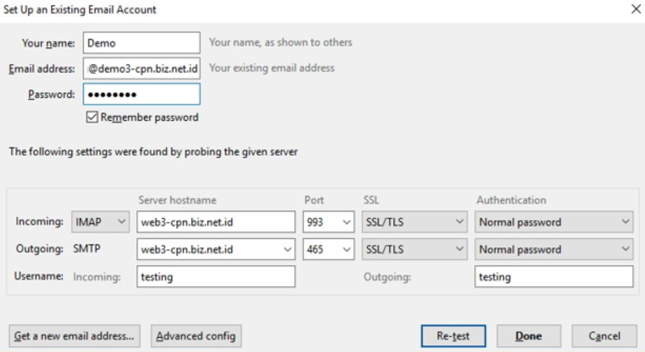 4. Sesuaikan dengan informasi yang ada di Webmail. Pada bagian Incoming, pilih IMAP dengan server hostname seperti yang tertera di Webmail dengan port 993. Sama halnya dengan bagian Outgoing, pilih SMTP dengan server hostname yang sama serta port 465. Pada bagian username tulis alamat email Anda (seperti yang tertera pada informasi Webmail). Setelah itu, klik Re-Test.
